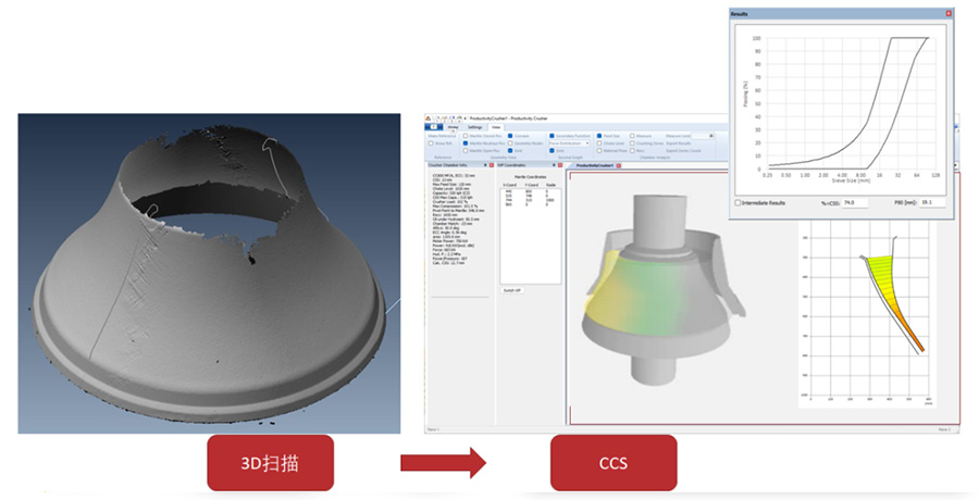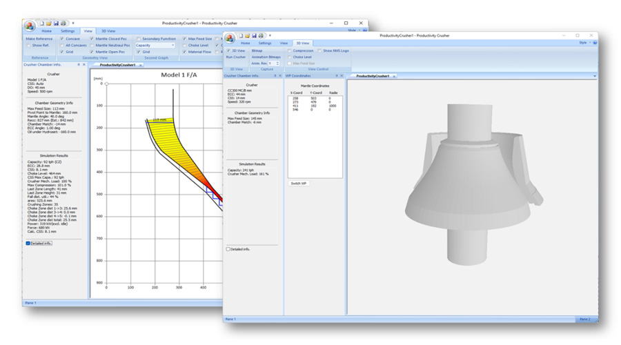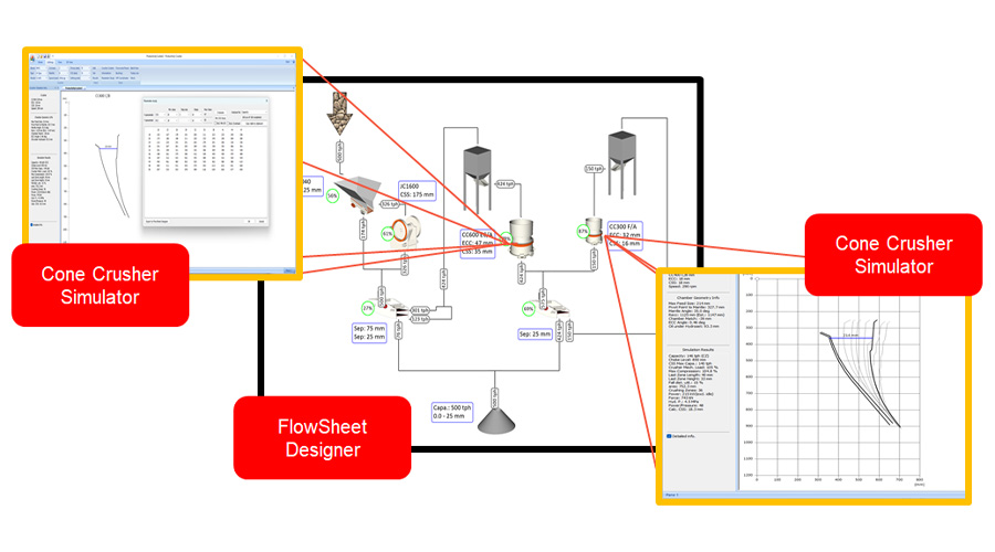 結(jié)合信息化技術(shù)開發(fā)出的一款具有自主知識產(chǎn)權(quán)的破碎機設(shè)計優(yōu)化模擬軟件Cone Crusher Simulator,配合NMS的流程設(shè)計軟件Flow sheet designer提供設(shè)備生產(chǎn)性能預(yù)測,為前期工藝流程設(shè)計中的設(shè)備選型提供有效的數(shù)據(jù)支撐,降低工藝設(shè)計期望與實際生產(chǎn)效果之間的差異。